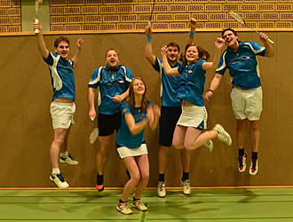 Nun folgte das Mixed von Nina&Stefan und Amelies Einzel. Beide Punkte konnten wir leider nicht holen, trotz festen Plan, Familie Schumann endlich zu schlagen. Also stand es das alles entscheidende 3:3 Die Einzel mussten es also reißen! Björn schlug zuerst zu und holte sicher den Punkt zum Unentschieden. Flo und Timo kämpften mühsam um den Siegpunkt, den Flo dann relativ sicher und unter Huldigung seiner Mannschaftskollegen holte, während Timo (nichtsahnend) im dritten Satz weiterhin für sein Team alles gab ;) Am Ende stand es glücklich 5:3 und wir feierten unseren ersten Sieg über den vermutlich schwersten Gruppengegner.