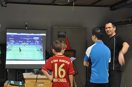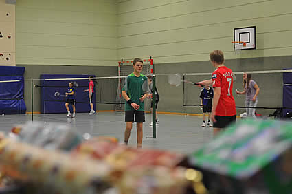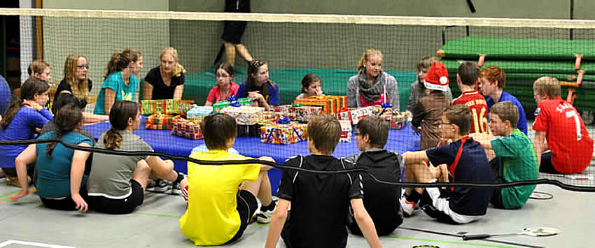 Bald schon waren Sitzgelegenheiten und ein riesiges "Schnöcker-Buffet" aufgebaut. Alle großen Matten zu einer einladenen "Chill-Ecke" zusammen getragen. Jimmy hatte zudem ein paar spannende Badminton-Clips dabei. Für die richtige Stimmung sorgte besonders das Weihnachtsvideo mit den vier besten Badminton-Einzel-Spielern der Weltrangliste an. Und als Heike dann auch noch schwer bepackt (irgendwie sah es ganz dananch aus, als ob sie unterwegs noch den verfrühten Weihnachtsmann getroffen hätte) in die Halle kam, sah es tatsächlich ein bißchen nach Weihnachten aus...