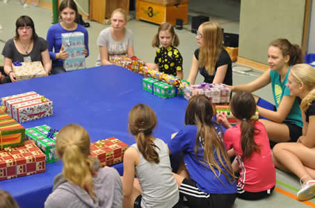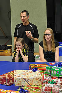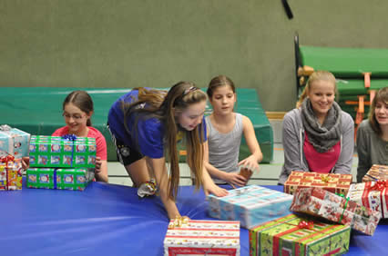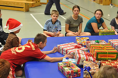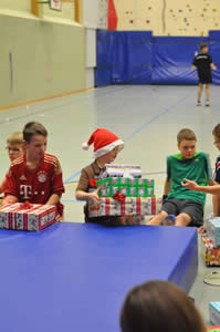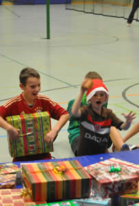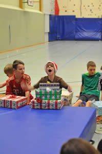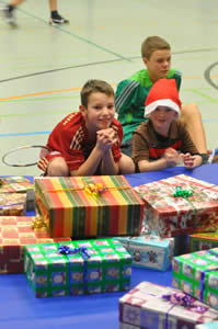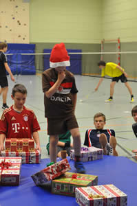Zum fortgeschrittenen Nachmittag war dann plötzlich Björn's durchdringender Pfiff zu hören - schon immer ein sicheres Zeichen, dass der Trainer gerne Eure Aufmerksamkeit hätte. Tatsächlich sollte sich jetzt heraus stellten, dass all die ran geschafften Geschenke keine Deko vom vergangenen Weihnachtsturnier , sondern echt waren. Mit einem Julklapp-Spiel sollten diese nun ihre Besitzer finden.
