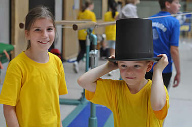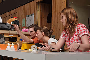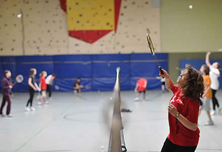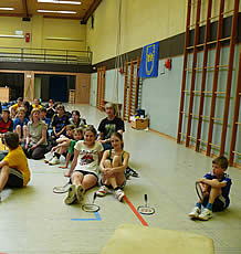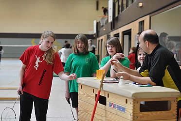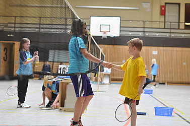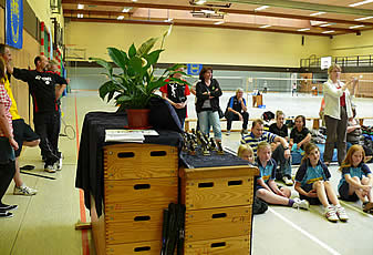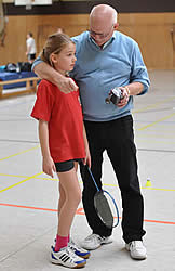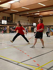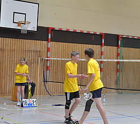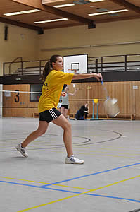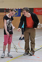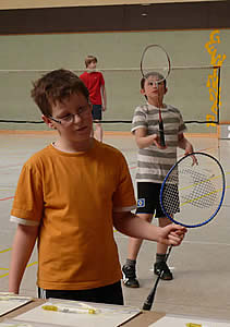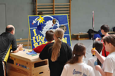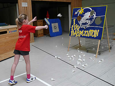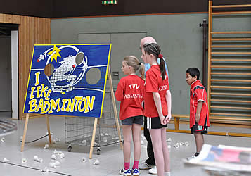Und während einige schon in ihren Gruppenspielen antraten, konnten sich andere neugierig schon einmal an der aufgestellten Badminton-Torwand probieren - wenn auch zunächst erst mal zögerlich ;-)
