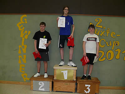 Und während neben dem Feld die BSVer beide Athleten gleichermaßen anfeuerten, waren die Nerven von Mutter Göing auf der Tribüne bis zum zerreißen gespannt. Am Ende der Gesamtwertung belegte Jesse den 2. und Finn den 3. Platz. Henrik Lüdemann vom TuS Elsdorf konnte sich nach einem aufreibenden Spiel gegen den einzigen U19er Christian Vagt vom TuS Berne den 1. Platz bei den U17ern sichern.
