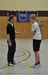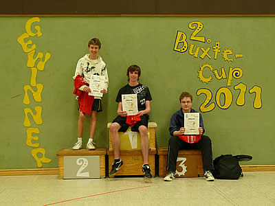 Die beiden Buxtehuder Jesse Göing und Finn Prenzel begeisterten sowohl ihre Trainerin Heike Koch wie auch ihre vielen Fans und Vereinskameraden. Gerade Finn, der sich erst vor einem viertel Jahr entschied, das Freizeittraining zu verlassen und zu den "Hoffnungsträgern" zu wechseln, zeichnete sich durch ungebrochenen Kampfgeist und gute Schläge aus. Sein Kamerad Jesse Göing - bisher noch der deutlich Stärkere von beiden - musste an diesem Tag alles aufbieten und konnte Finn erst nach drei hart umkämpften Sätzen bezwingen. Es waren vor allem seine Ruhe und der bessere Überblick über das Spielgeschehen, welche letztendlich zum Sieg führten.