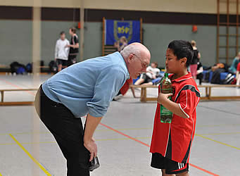 Mit einer viertel Stunde Verspätung konnten wir schließlich unsere Begrüßung der U11er und U13er um 11.15 Uhr starten. Bei den U11ern hatten sich 4 Mädchen und 2 Jungen angemeldet. Diese starteten dann gemeinsam in einer großen Gruppe und spielten die Sieger untereinander aus (zur Siegerermittlung wurde dann wieder in Jungen und Mädchen aufgeteilt). Ragil Atmojo war mit seinen gerade mal 8 Jahren in diesem Jahr der jüngste Teilnehmer.