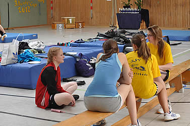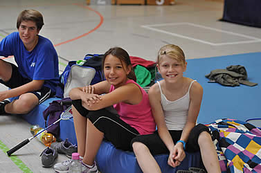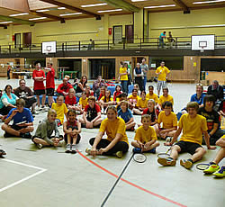 Denn hier waren die ersten Teilnehmer bereits 1 1/2 Stunden vorher angekommen. Mit langen Anfahrtzeiten zum Beispiel aus Waldenau, Walsrode oder Pinneberg waren die Anreisenden lieber auf Nummer sicher gegangen. Gesagt, getan - nach ein paar Willkommensworten hatten sie die Möglichkeit es sich entweder auf den Matten in der Halle oder auf der Tribüne gemütlich zu machen. Schnell waren die Schläger raus geholt um sich schon einmal einzuspielen. Solch eine Begeisterung für den Badminton-Sport ist immer wieder toll mit anzusehen...!