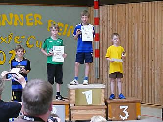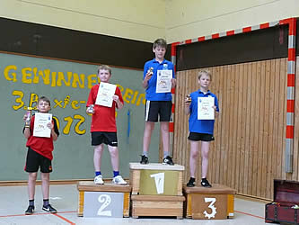 Am Schluss des Turniers ging dann aber keiner leer aus. Für die 3 Erstplatzierten gab es Urkunden und T-Shirts, alle Übrigen bekamen eine Teilnahme-Urkunde und durften sich etwas aus der Schatzkiste aussuchen. Die Sieger sahen dann wie folgt aus:
