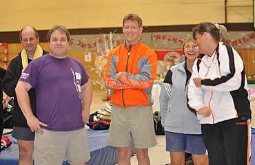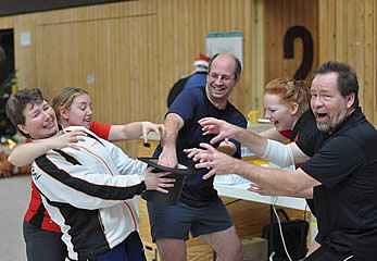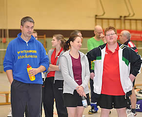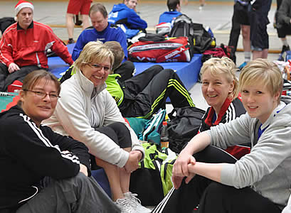 Da wir selber mit teilweise gerade einmal 500 Meter Luftlinie schon Schwierigkeiten hatten zur Halle zu kommen, mochten wir uns gar nicht ausmalen, wie es unseren Mixed-Paaren da am frühen Sonntagmorgen erging. Es grenzte schon fast an einem Wunder, dass bis auf ein einziges Paar alle den Weg zu uns fanden. Verspätungen nahmen wir da gerne in Kauf - Hauptsache alle waren heil und gesund angekommen. Zumal es der guten Laune keinen Abbruch getan hatte. Besonders die Finkenwerder Kameraden sorgten mit geschulterter Weihnachtsmusik für Stimmung beim herein kommen.