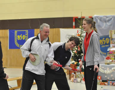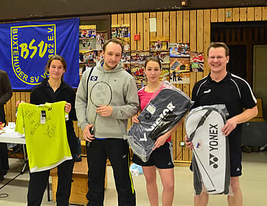 Neben der Siegerehrung zum Schluss war mit Sicherheit die Samstagsverlosung ein weiteres Highlight. Auch in diesem Jahr hatten wir es einrichten können vier ganz besondere Preise zu organisieren. Neben zwei großen Sporttaschen gab es ein Shirt mit diversen Autogrammen von internationalen Top-Spielern (unter anderem Lee Chong Wei, Chen Long, Lin Dan, Saina Nehwal, Jiang Yanjiao, Wang Yihan, Carsten Mogensen, Mathias Boe und auch Juliane Schenk, welche auf der Vorderseite allen Teilnehmern viel Spaß wünschte) und den neuesten Yonex-Schläger - den Nanoray 700 zu gewinnen.